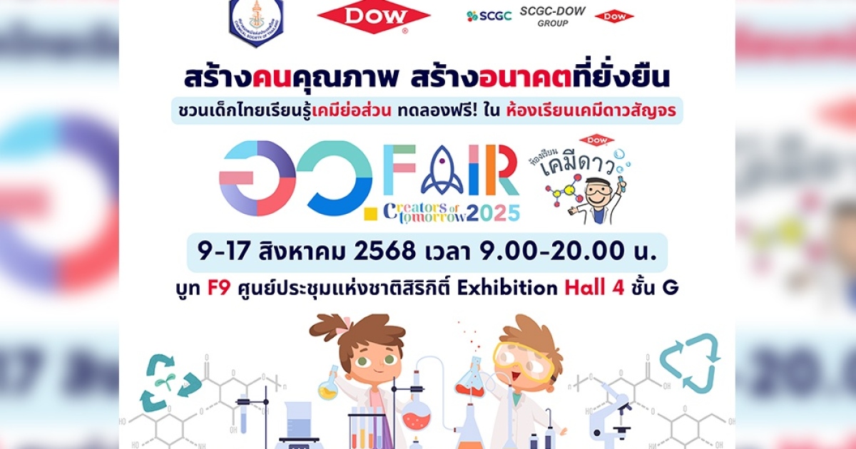 เมื่อวันที่ 7 สิงหาคม 2568 สมาคมเคมีแห่งประเทศไทยฯ ร่วมกับกลุ่มบริษัท ดาว ประเทศไทย (Dow) ขอเชิญชวนเยาวชน นักเรียน นักศึกษา ครู อาจารย์ ตลอดจนประชาชนทั่วไป ร่วมเยี่ยมชมฟรี! กับบูทกิจกรรม “ห้องเรียนเคมีดาวสัญจร” ที่นำเสนอการสาธิตเคมีแบบย่อส่วนที่ได้รับการยอมรับจากองค์การยูเนสโก ซึ่งเป็นรูปแบบการทดลองที่ปลอดภัย ประหยัด ใช้สารเคมีในปริมาณน้อย ช่วยลดเวลาและของเสียในการทดลอง ทั้งยังเป็นมิตรต่อสิ่งแวดล้อม สามารถนำไปปรับใช้ได้จริงในโรงเรียนทั่วประเทศ เพื่อส่งเสริมการเรียนรู้วิทยาศาสตร์อย่างมีประสิทธิภาพ ในงาน “อว.แฟร์ SCI POWER FOR FUTURE THAILAND” ภายใต้ธีม “Creators Of Tomorrow” ซึ่งจัดขึ้นโดยกระทรวงการอุดมศึกษา วิทยาศาสตร์ วิจัยและนวัตกรรม ระหว่างวันที่ 9-17 สิงหาคม 2568 เวลา 9.00 – 20.00 น. ณ Exhibition Hall 1–4 ชั้น G ศูนย์การประชุมแห่งชาติสิริกิติ์
