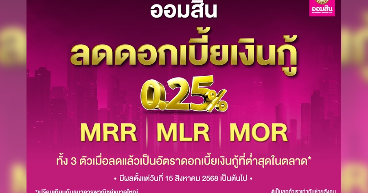 ออมสิน ประกาศลดดอกเบี้ยเงินกู้ทุกตัว 0.25% ทั้ง MRR MLR และ MOR มีผล 15 สิงหาคม 68 หวังช่วยกระตุ้นเศรษฐกิจทั้งระบบ