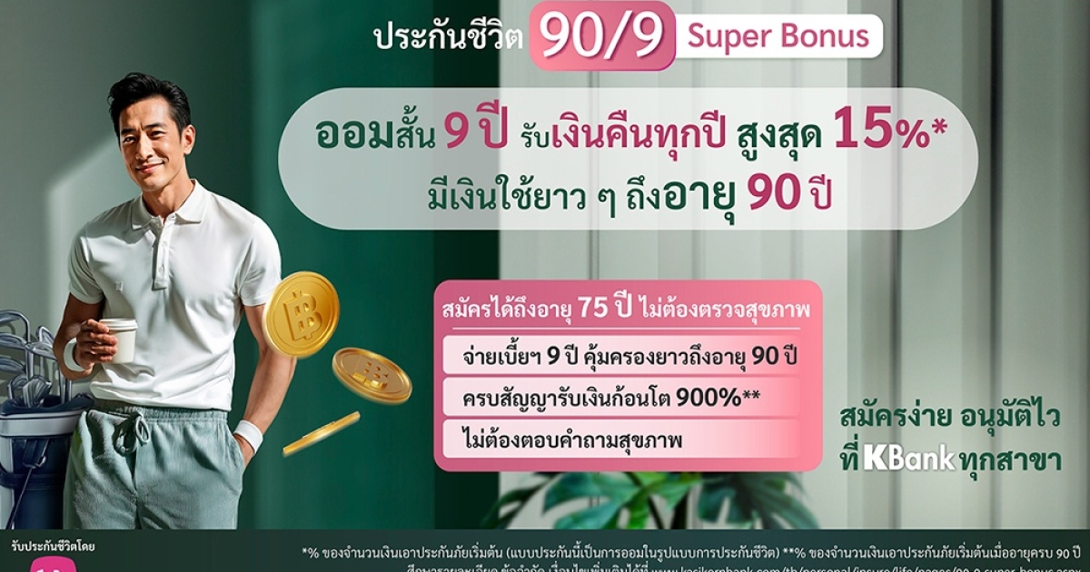 เปลี่ยนเบี้ยประกันที่จ่ายในวันนี้ เป็นรายรับที่ต่อเนื่องในวันข้างหน้า เพื่อชีวิตที่มั่นคงกว่า จุดเริ่มต้นของการลงทุนเพื่อความมั่นคงของคุณและคนที่คุณรัก สอบถามรายละเอียดเพิ่มเติมเกี่ยวกับ ประกันชีวิต 90/9 Super Bonus กรุณาติดต่อที่ ธนาคารกสิกรไทย ทุกสาขา ทั่วประเทศ