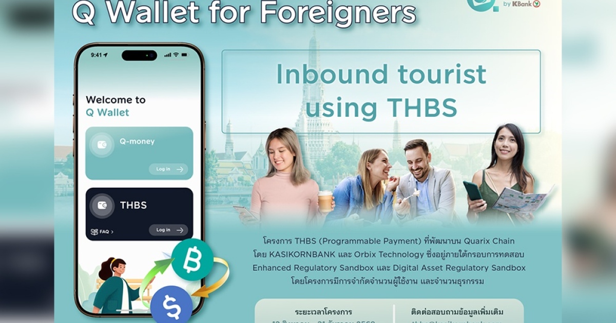 ธนาคารกสิกรไทย ปักธงผู้นำนวัตกรรมการเงิน เดินหน้ายกระดับระบบการเงินไทยสู่ยุคใหม่ เปิดตัวการทดสอบ “Q Wallet” กระเป๋าเงินดิจิทัลที่พัฒนาจากเทคโนโลยีบล็อกเชน พลิกโฉมระบบการชำระเงินไร้พรมแดน สำหรับนักท่องเที่ยวชาวต่างชาติและร้านค้าไทย นักท่องเที่ยวชาวต่างชาติในประเทศไทย สามารถนำ USDC แลกเปลี่ยนเป็น THBS (Programmable Payment) ซึ่งเป็นหน่วยข้อมูลอิเล็กทรอนิกส์ที่มีกลไกการรักษามูลค่าในรูปแบบเงินฝากสกุลบาทที่สามารถใช้เป็นสื่อกลางในการแลกเปลี่ยนสินค้า และบริการในประเทศไทยได้แบบเรียลไทม์ โดยใช้ชำระเงินผ่านระบบ THAI QR Payment กับร้านค้าได้ ไม่ต้องมีบัญชีธนาคารในประเทศ เพื่อส่งเสริมโครงสร้างพื้นฐานด้านการเงินดิจิทัล ขับเคลื่อนเศรษฐกิจไร้เงินสด มุ่งยกระดับบริการทางการเงินของไทยสู่ระดับสากล