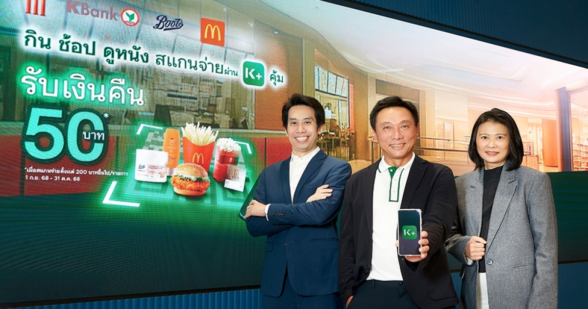 ดร.เกษชญง สกาวรัตนานนท์ รองผู้จัดการใหญ่ (กลาง) ธนาคารกสิกรไทย นายนรุตม์ เจียรสนอง (ซ้าย) รองประธานเจ้าหน้าที่บริหารฝ่ายการตลาด บมจ. เมเจอร์ ซีนีเพล็กซ์ กรุ้ป และนางสาวพรรณี ศานติวิวัฒน์กุล (ขวา) ผู้อำนวยการฝ่ายการตลาด บริษัท บู๊ทส์ รีเทล (ประเทศไทย) จำกัด ร่วมด้วย บริษัท แมคไทย จำกัด เปิดตัวโปรโมชันพิเศษให้ลูกค้า K PLUS ที่ซื้อสินค้าหรือใช้บริการที่ 3 ร้านค้าแบรนด์ดัง เพียงชมภาพยนตร์ทุกเรื่องทุกรอบที่ Major Cineplex ช้อปสินค้าสุขภาพและความงามที่ Boots หรืออิ่มอร่อยทุกเมนูที่ McDonald’s ทุกสาขาทั่วประเทศ แล้วสแกนจ่ายด้วย K PLUS ผ่านเครื่องรับชำระเงินธนาคารกสิกรไทย ตั้งแต่ 200 บาทขึ้นไปต่อรายการ รับเงินคืนคุ้ม 50 บาท (จำกัด 1 ท่านต่อ 1 สิทธิ์ต่อแบรนด์ต่อเดือน จำกัด 4,500 สิทธิ์ต่อแบรนด์ตลอดแคมเปญ รวมจำกัด 13,500 สิทธิ์ ตลอดระยะรายการส่งเสริมการขาย) ตั้งแต่ 1 กันยายน 2568 – 31 ตุลาคม 2568