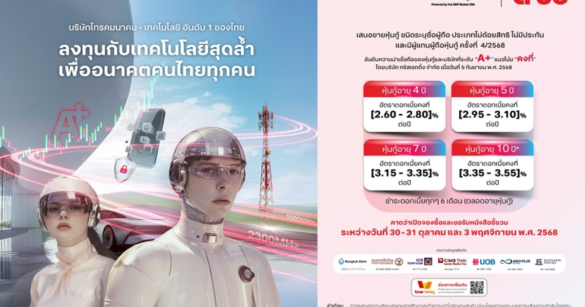 เมื่อวันที่ 12 กันยายน 2568 บริษัท ทรู คอร์ปอเรชั่น จำกัด (มหาชน) บริษัทโทรคมนาคมเทคโนโลยีชั้นนำของไทย และอันดับ 1 ของโลกด้านความยั่งยืน ด้วยคะแนน DJSI 2024 สูงสุดในกลุ่มอุตสาหกรรมโทรคมนาคมต่อเนื่องเป็นปีที่ 7 พร้อมเดินหน้าสู่อนาคตด้วยความมั่นคง เตรียมเสนอขายหุ้นกู้ชุดใหม่ให้แก่ผู้ลงทุนทั่วไป จำนวน 4 ชุด อายุระหว่าง 4 ถึง 10 ปี อัตราดอกเบี้ยคงที่ระหว่าง [2.60 – 3.55]% ต่อปี และอันดับความน่าเชื่อถือ “A+” แนวโน้ม “คงที่” จากบริษัท ทริสเรทติ้ง จำกัด ตอกย้ำความแข็งแกร่งของบริษัท ทรู คอร์ปอเรชั่น จำกัด (มหาชน) ในธุรกิจโทรคมนาคมและธุรกิจเทคโนโลยีดิจิทัล คาดเปิดให้จองซื้อระหว่างวันที่ 30-31 ตุลาคม และวันที่ 3 พฤศจิกายน 2568 ผ่าน 7 สถาบันการเงินชั้นนำได้แก่ ธนาคารกรุงเทพ กสิกรไทย ไทยพาณิชย์ ซีไอเอ็มบีไทย ยูโอบี บริษัทหลักทรัพย์เกียรตินาคินภัทร และบริษัทหลักทรัพย์ เอเซีย พลัส รวมถึงการขายผ่านแอปพลิเคชัน TrueMoney Wallet โดยมีธนาคารกรุงศรีอยุธยา เป็นนายทะเบียนหุ้นกู้และผู้แทนผู้ถือหุ้นกู้