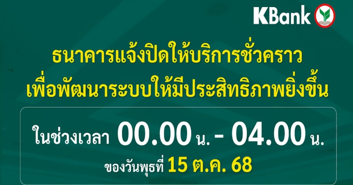 กสิกรไทยแจ้งปิดให้บริการชั่วคราว เป็นเวลา 4 ชั่วโมง ช่วง 00.00-04.00 น. ของ 15 ต.ค. 68