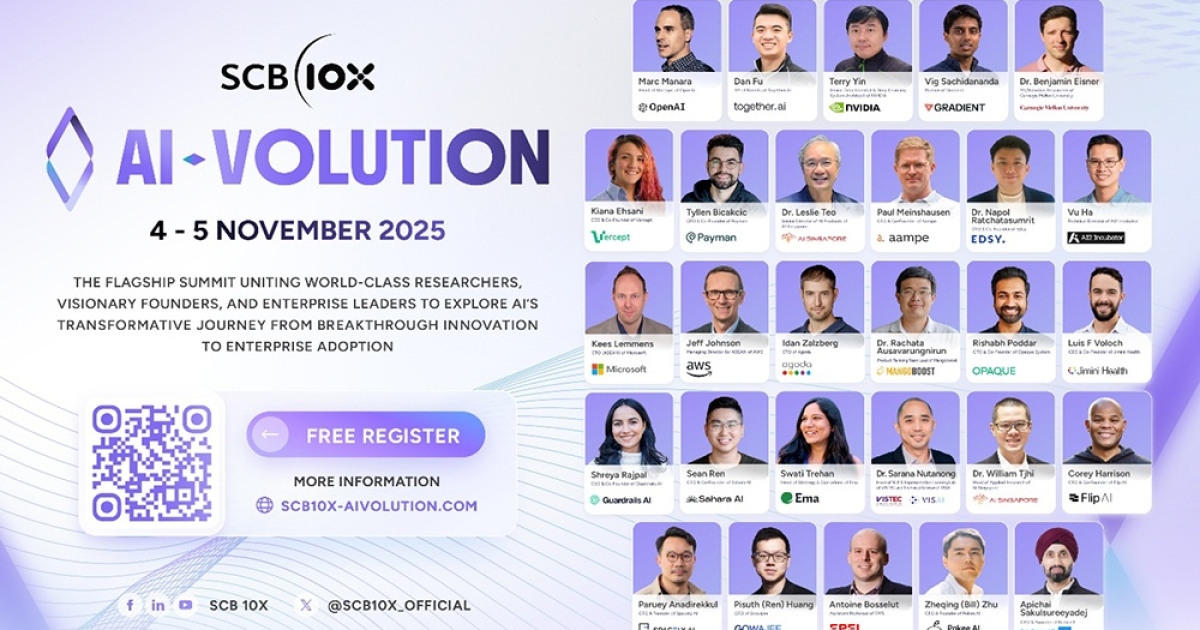 เอสซีบี เท็นเอกซ์ (SCB 10X) บริษัทด้านการลงทุนในเทคโนโลยีเปลี่ยนโลก (Disruptive Technology) ภายใต้กลุ่มเอสซีบีเอกซ์ (SCBX Group) ประกาศจัดงานสัมมนาออนไลน์ระดับโลกด้าน AI เป็นครั้งแรก ภายใต้ชื่อ “AI-VOLUTION” ระหว่างวันที่ 4-5 พฤศจิกายน 2568 เวลา 08.00-16.00 น. (ตามเวลาประเทศไทย) เปิดให้ผู้สนใจจากทั่วโลกเข้าร่วมรับชมฟรีผ่านระบบออนไลน์