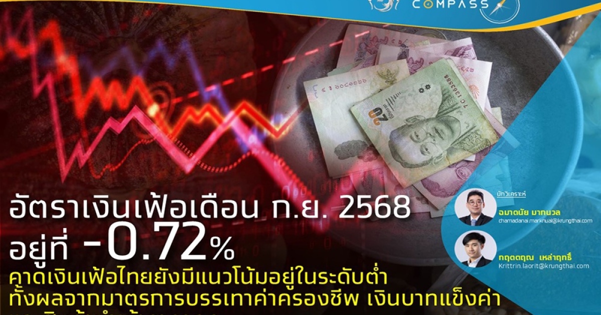 - Krungthai COMPASS คาดเงินเฟ้อของไทยยังขาดแรงส่งต่อไปในระยะข้างหน้า ส่วนหนึ่งเป็นผลจากมาตรการบรรเทาภาระค่าใช้จ่ายของภาครัฐล่าสุด โดยเฉพาะการปรับลดค่า Ft (งวด ก.ย.-ธ.ค. 68) ที่จะส่งผลให้ค่าไฟฟ้าต่ำลง และการลดราคาน้ำมันเชื้อเพลิง นอกจากนี้ เงินบาทที่แข็งค่า รวมถึง การตีตลาดของสินค้าราคาถูกจากต่างประเทศ ท่ามกลางภาวะเศรษฐกิจไทยที่มีแนวโน้มชะลอตัว ต่างเป็นปัจจัยที่จะส่งผลให้ระดับราคาโดยรวมยังคงอยู่ในระดับต่ำ
