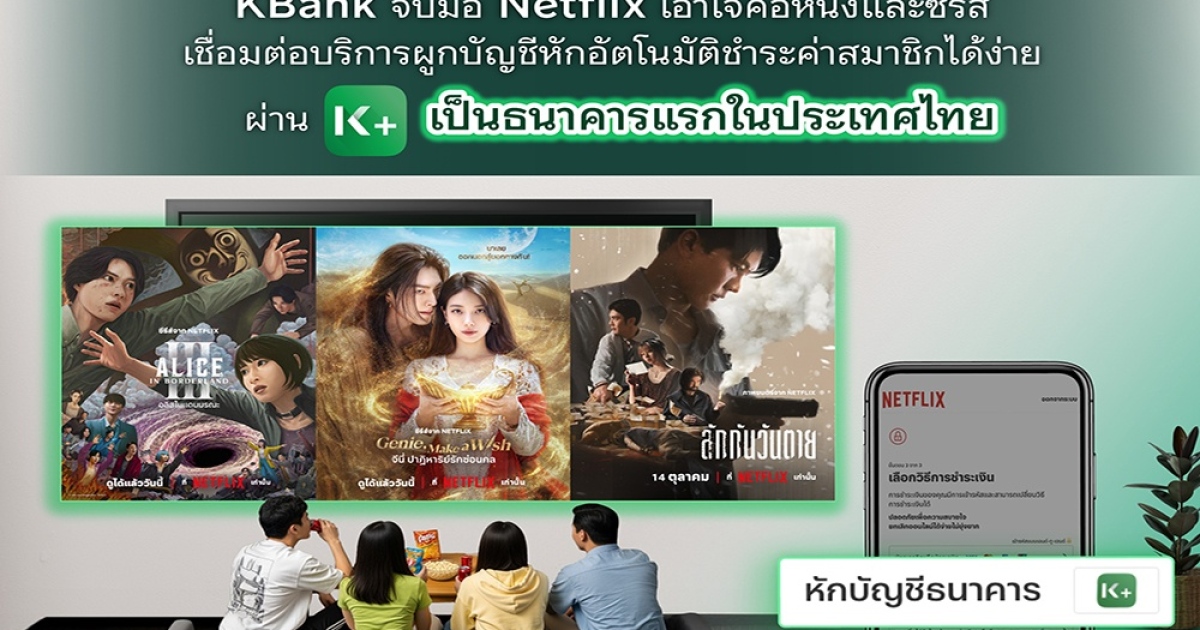 KBank จับมือ Netflix เอาใจคอหนังและซีรีส์ เชื่อมต่อบริการผูกบัญชีหักอัตโนมัติชำระค่าสมาชิกได้ง่ายผ่าน K PLUS เป็นธนาคารแรกในประเทศไทย