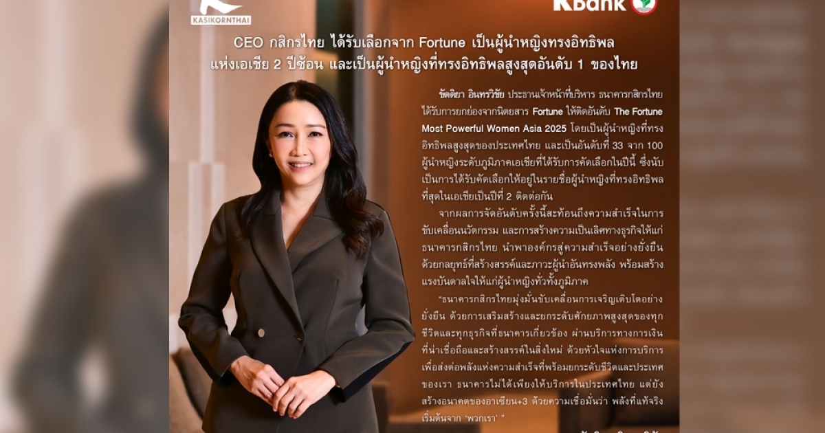 CEO กสิกรไทย ได้รับเลือกจาก Fortune เป็นผู้นำหญิงทรงอิทธิพลแห่งเอเชีย 2 ปีซ้อน และเป็นผู้นำหญิงที่ทรงอิทธิพลสูงสุดอันดับ 1 ของไทย
