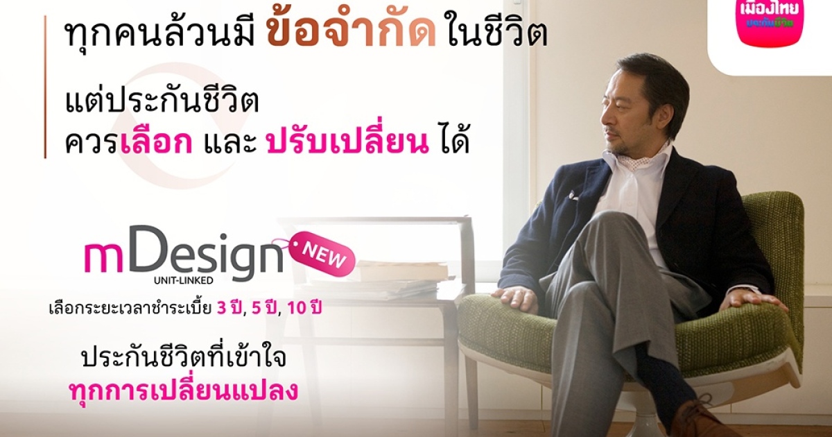 เมืองไทยประกันชีวิต เพิ่มตัวช่วยสร้างพอร์ตชีวิตของคุณให้เติบโตอย่างมั่นคง ด้วยประกันชีวิตควบการลงทุน mDesign จ่ายเบี้ยสั้น 3-5-10 ปี รับความคุ้มครองยาวถึงอายุ 99 ปี การันตีคุ้มครองชีวิตระหว่างช่วงเวลา ชำระเบี้ย