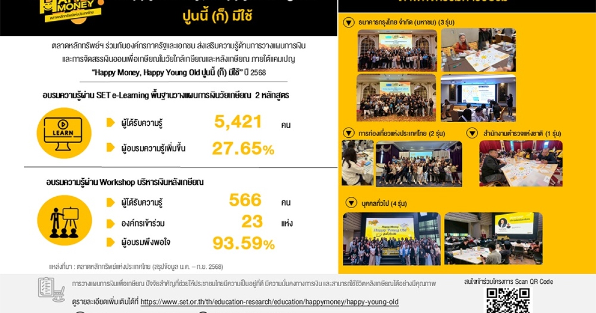 ตลาดหลักทรัพย์แห่งประเทศไทย ร่วมกับพันธมิตรภาครัฐและเอกชน จัดโครงการ “Happy Money, Happy Young Old ปูนนี้ (ก็) มีใช้” ต่อเนื่องในปี 2568 เพื่อส่งเสริมการวางแผนและบริหารเงินออมหลังเกษียณ จัดอบรมรวม 10 รุ่น แก่บุคคลทั่วไปและบุคลากรในองค์กรต่าง ๆ โครงการได้รับผลตอบรับอย่างดี โดยมีผู้ที่ได้รับความรู้ผ่าน SET e-Learning หลักสูตรพื้นฐานวางแผนการเงินวัยเกษียณกว่า 5,421 คน ซึ่งมีความรู้เพิ่มขึ้นเฉลี่ย 27.65% นอกจากนี้มีเข้าร่วมเวิร์กชอปบริหารเงินหลังเกษียณกว่า 566 คน และมีผู้รับคำแนะนำจากนักวางแผนการเงินรายบุคคล 60 คน ในกิจกรรม Financial Planning Clinic