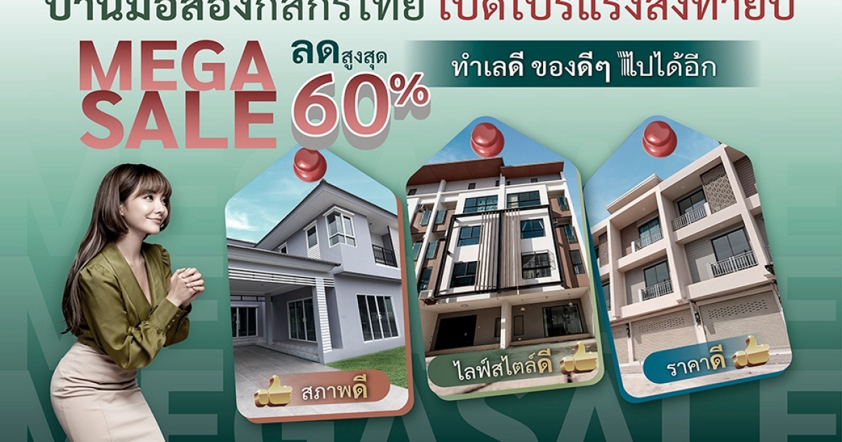 แคมเปญบ้านมือสองของดี ๆ ไปได้อีก Mega Sale ลดสูงสุด 60% ถือเป็นโอกาสทองสำหรับผู้ที่กำลังมองหาทรัพย์เพื่ออยู่อาศัยเองหรือเพื่อการลงทุนในช่วงปลายปี ด้วยจุดเด่น “ราคาดี ทำเลดี สภาพดี และไลฟ์สไตล์ที่ใช่” ที่คัดสรรมาอย่างครบครัน ตั้งแต่วันที่ 1 พฤศจิกายน 2568 ถึง 31 ธันวาคม 2568 นี้ โดยเลือกดูทรัพย์ผ่านบริการออนไลน์แบบครบวงจร ตั้งแต่ค้นหาทรัพย์ นัดหมายชมทรัพย์ ไปจนถึงบริการขอสินเชื่อภายในเว็บไซต์เดียว