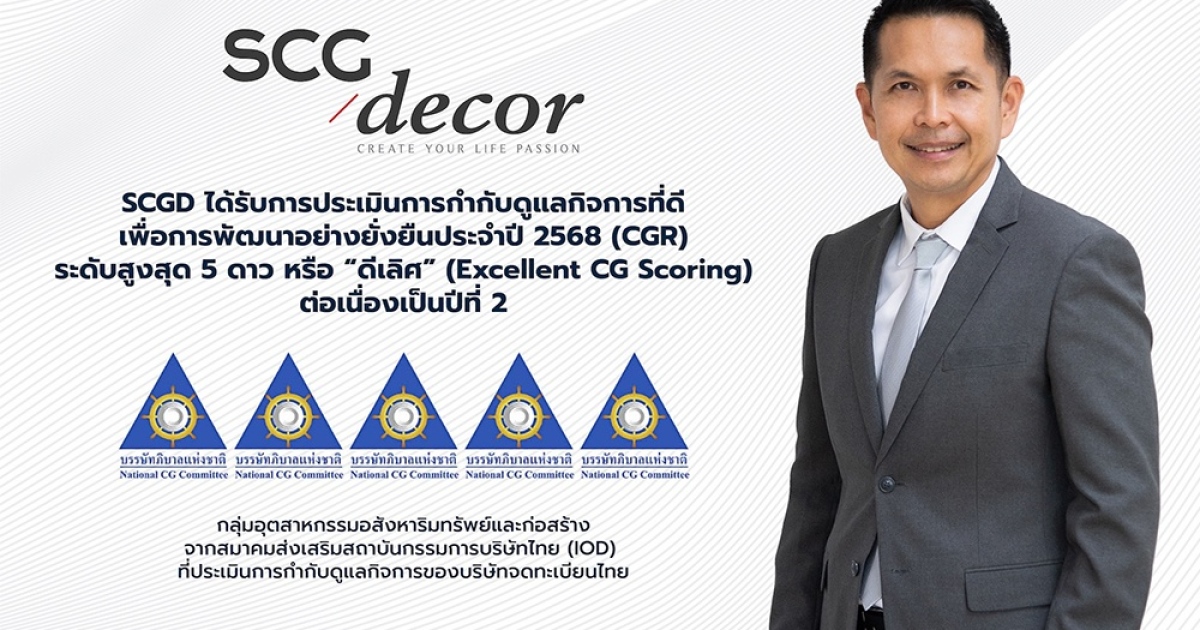 SCG Decor หรือ SCGD ได้รับการประเมินการกำกับดูแลกิจการที่ดี เพื่อการพัฒนาอย่างยั่งยืนประจำปี 2568 (CGR) ระดับสูงสุด 5 ดาว หรือ “ดีเลิศ” (Excellent CG Scoring) กลุ่มอุตสาหกรรมอสังหาริมทรัพย์และก่อสร้าง ต่อเนื่องเป็นปีที่ 2 จากสมาคมส่งเสริมสถาบันกรรมการบริษัทไทย (IOD) ที่ประเมินการกำกับดูแลกิจการของบริษัทจดทะเบียนไทย ประจำปี 2568 ตอกย้ำความมุ่งมั่นในการดำเนินธุรกิจด้วยความโปร่งใส เป็นธรรม รับผิดชอบต่อสังคม เพื่อขับเคลื่อนการเติบโตอย่างยั่งยืน