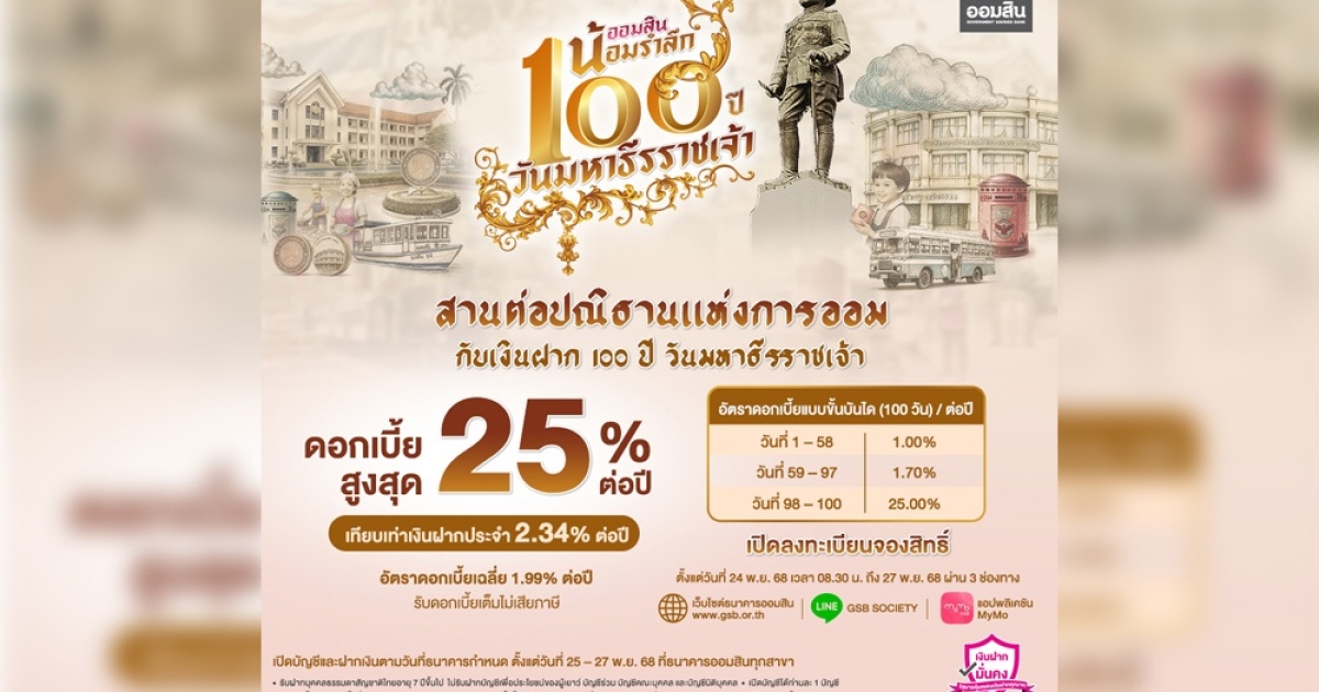 ออมสิน ออกเงินฝากส่งเสริมการออม น้อมรำลึกในพระมหากรุณาธิคุณ รัชกาลที่ 6 “เงินฝาก 100 ปี วันมหาธีรราชเจ้า” ฝาก 100 วัน ดอกเบี้ย Step up สูงสุด 25% ต่อปี จองสิทธิ์ 24 พ.ย. นี้
