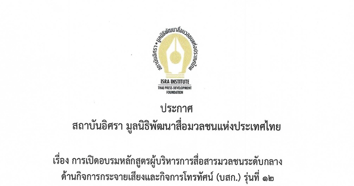 สถาบันอิศรา มูลนิธิพัฒนาสื่อมวลชนแห่งประเทศไทย ประกาศการเปิดอบรมหลักสูตรผู้บริหารการสื่อสารมวลชนระดับกลาง ด้านกิจการกระจายเสียงและกิจการโทรทัศน์ (บสก.) รุ่นที่ 12