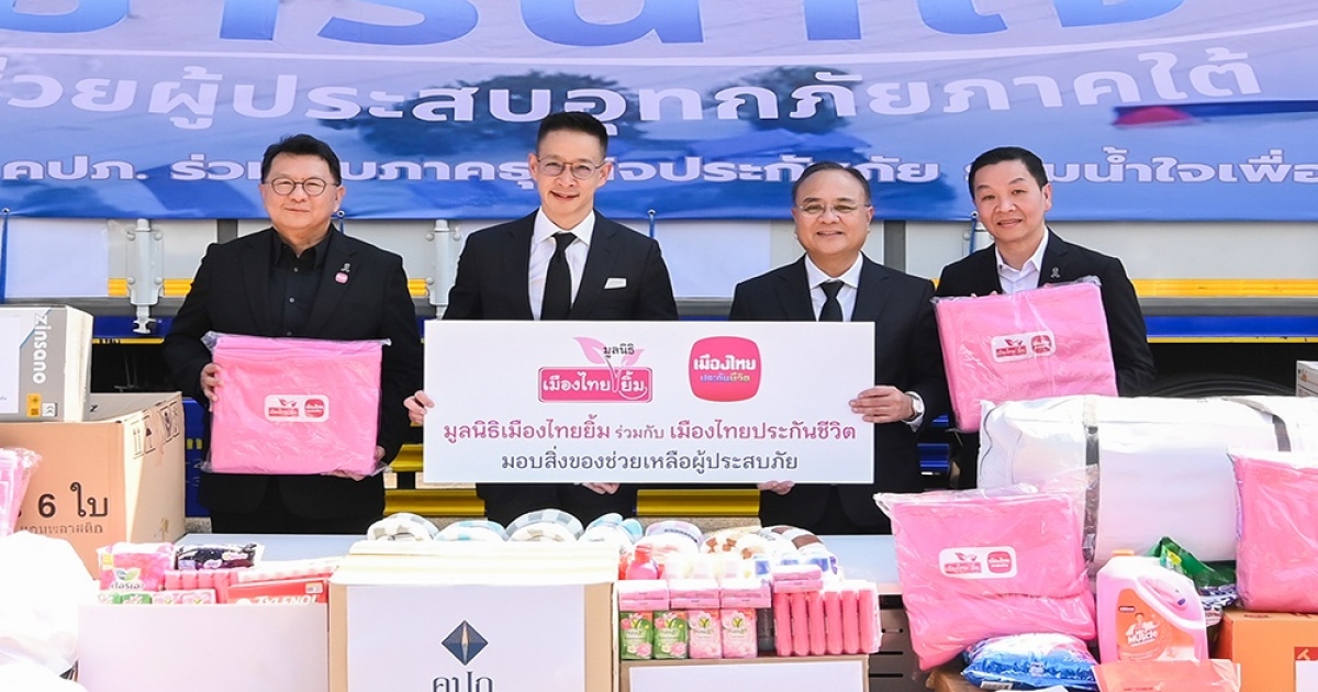 บริษัท เมืองไทยประกันชีวิต จำกัด (มหาชน) และมูลนิธิเมืองไทยยิ้ม ร่วมสนับสนุนการช่วยเหลือผู้ประสบอุทกภัยในพื้นที่ภาคใต้ ผ่านโครงการ “ธารน้ำใจช่วยผู้ประสบภัยภาคใต้” ของสำนักงานคณะกรรมการกำกับและส่งเสริมการประกอบธุรกิจประกันภัย (คปภ.) โดยได้ส่งมอบผ้าห่มเพื่อช่วยบรรเทาความเดือดร้อนและสร้างขวัญกำลังใจให้แก่ประชาชนที่ได้รับผลกระทบจากสถานการณ์น้ำท่วม ในหลายจังหวัดภาคใต้