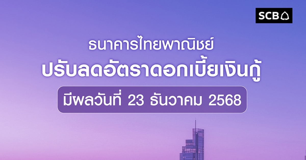 ธนาคารไทยพาณิชย์ ปรับลดอัตราดอกเบี้ยเงินกู้สูงสุด 0.25% มีผลวันที่ 23 ธันวาคม 2568