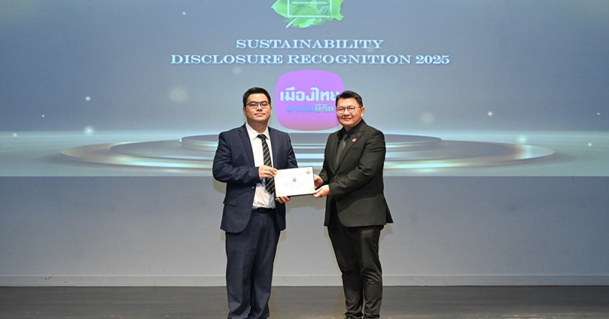 บริษัท เมืองไทยประกันชีวิต จำกัด (มหาชน) รับรางวัลประกาศเกียรติคุณ (Sustainability Disclosure Recognition) ประจำปี 2568 ในพิธีมอบรางวัลการเปิดเผยข้อมูลความยั่งยืนประจำปี 2568 จัดโดยสถาบันไทยพัฒน์ สะท้อนความมุ่งมั่นในการเป็นองค์กรที่เปิดเผยข้อมูลด้านความยั่งยืนอย่างโปร่งใสรอบด้าน มีคุณภาพ และสอดคล้องตามเป้าหมายการพัฒนาที่ยั่งยืน (SDGs)