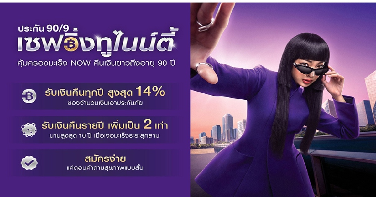 ประกัน “เซฟวิ่งทูไนน์ตี้” ได้รับการออกแบบมาเพื่อเป็นทางเลือกที่ตอบโจทย์ลูกค้า ที่ให้ความคุ้มครองเพิ่มเกี่ยวกับโรคมะเร็งซึ่งถือเป็นโรคร้ายที่สร้างความกังวลให้กับคนไทยในปัจจุบัน ถือเป็นความคุ้มค่า และครอบคลุมทั้งทางด้านการเก็บเงินระยะยาว เบี้ยประกันภัยสามารถลดหย่อนภาษีได้ การันตีเงินคืนต่อเนื่อง และให้ความคุ้มครองมะเร็งระยะลุกลาม เหมาะกับคนยุคใหม่ที่ต้องการวางแผนชีวิตหลังเกษียณ แม้เจ็บป่วยเป็นโรคร้าย ก็ยังมีเงินเก็บที่ดูแลตัวเองได้