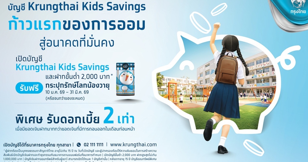 ธนาคารกรุงไทย ต้อนรับวันเด็กแห่งชาติ เชิญชวนผู้ปกครองร่วมสร้างอนาคตที่มั่นคงให้บุตรหลาน ด้วยการเริ่มต้นก้าวแรกของการออม ผ่านบัญชีเงินฝากออมทรัพย์พิเศษสำหรับผู้เยาว์ Krungthai Kids Savings พร้อมมอบสิทธิประโยชน์สุดพิเศษ รับดอกเบี้ยและโบนัสรวมเป็น 2 เท่า และ กระปุกรักษ์โลก “น้องวายุ” เพื่อปลูกฝังวินัยการออมอย่างสม่ำเสมอตั้งแต่วัยเยาว์ สู่รากฐานทางการเงินที่มั่นคงในอนาคต