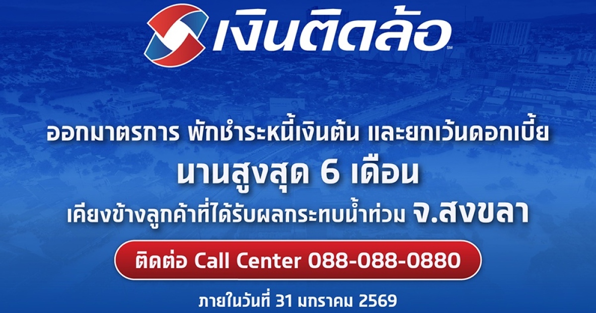 “เงินติดล้อ” ออกมาตรการพักชำระหนี้เงินต้นและยกเว้นดอกเบี้ย ให้กับลูกค้าสินเชื่อที่ได้รับผลกระทบจากเหตุการณ์น้ำท่วมในพื้นที่ จ.สงขลา เป็นระยะเวลานานสูงสุด 6 เดือน โดยลูกค้าสินเชื่อที่ได้รับผลกระทบจากน้ำท่วมในพื้นที่ จ.สงขลา สามารถติดต่อสอบถามมาตรการพักชำระหนี้ภายในวันที่ 31 มกราคม 2569 หรือสอบถามรายละเอียดเพิ่มเติมได้ที่ Call Center หมายเลขโทรศัพท์ 088-088-0880 ตลอด 24 ชม.
