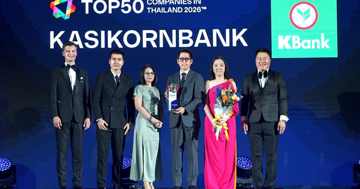 นายศาสตรา มังกรอัศวกุล (ที่ 3 จากขวา) รองผู้จัดการใหญ่ ธนาคารกสิกรไทย พร้อมด้วยผู้บริหารสายงานทรัพยากรบุคคล เป็นตัวแทนธนาคารรับมอบรางวัล 1 ใน 50 บริษัทชั้นนำที่น่าทำงานที่สุด ในงาน TOP50 Companies in Thailand 2026 จากผลสำรวจความคิดเห็นคนทำงานรุ่นใหม่กว่า 12,000 คน โดยธนาคารกสิกรไทยอยู่ในลำดับที่ 12 ของบริษัทที่น่าร่วมงานด้วยมากที่สุด และได้รับรางวัลมาอย่างต่อเนื่อง 8 ปีซ้อน สะท้อนมาตรฐานการบริหารคนและวัฒนธรรมองค์กรชั้นนำที่เติบโตไปพร้อมโลกการทำงาน โดยธนาคารกสิกรไทยยังคงมุ่งมั่นสนับสนุนให้คนทำงานได้เป็นตัวเองอย่างเต็มประสิทธิภาพ ผ่านวิธีการทำงานที่ให้พนักงานได้ ‘ลอง ลุย เติบโต’ พร้อมผสานการทำงานด้วย AI และ Innovation เพื่อยกระดับคุณภาพชีวิตของทั้งลูกค้าและสังคม รางวัลดังกล่าวจัดโดย WorkVenture ที่ปรึกษาและผู้ให้บริการแพลตฟอร์มค้นหางาน เพื่อยกย่องเชิดชูเกียรติแก่นายจ้างองค์กรชั้นนำในการบริหารจัดการองค์กรได้อย่างมีประสิทธิภาพ ณ ห้อง ฟูจิ แกรนด์บอลรูม โรงแรมนิกโก้ กรุงเทพฯ เมื่อเร็ว ๆ นี้