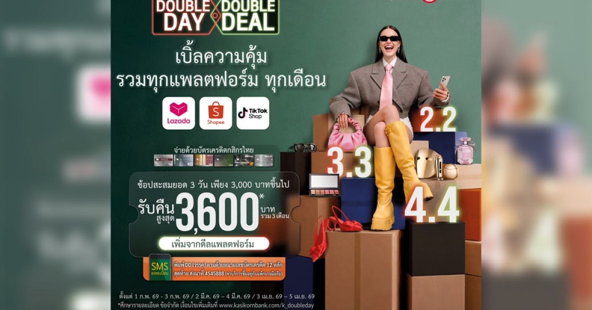 โดยลูกค้าบัตรเครดิตกสิกรไทยสามารถรับเครดิตเงินคืนสูงสุด 1,200 บาทต่อเดือน ในช่วงมหกรรม Double Day ที่กำหนด ได้แก่ วันที่ 1–3 กุมภาพันธ์, วันที่ 2–4 มีนาคม และวันที่ 3–5 เมษายน 2569 รวมรับเครดิตเงินคืนสูงสุด 3,600 บาท ตลอดระยะเวลาแคมเปญ
