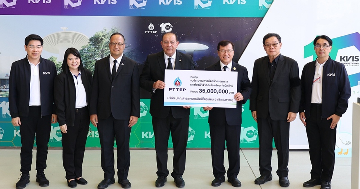 นายมนตรี ลาวัลย์ชัยกุล (กลาง) ประธานเจ้าหน้าที่บริหาร บริษัท ปตท.สำรวจและผลิตปิโตรเลียม จำกัด (มหาชน) หรือ ปตท.สผ. มอบเงินจำนวน 35 ล้านบาท ให้แก่ ดร.ไพรินทร์ ชูโชติถาวร (ที่ 3 จากขวา) ประธานกรรมการบริหารโรงเรียนกำเนิดวิทย์ เพื่อสนับสนุนโรงเรียนกำเนิดวิทย์ในการก่อสร้างอาคารวิทยาศาสตร์อวกาศ ซึ่งประกอบด้วยท้องฟ้าจำลอง และหอสังเกตการณ์ท้องฟ้าและอวกาศ เพื่อเป็นแหล่งเรียนรู้และวิจัยด้านดาราศาสตร์ ฟิสิกส์ขั้นสูง และเทคโนโลยีแห่งอนาคต และเป็นโอกาสให้นักเรียนได้เรียนรู้และเข้าใจหลักวิทยาศาสตร์ผ่านการลงมือปฏิบัติจริง ซึ่งจะเป็นการเสริมสร้างศักยภาพด้านวิทยาศาสตร์และเทคโนโลยีให้แก่เยาวชนและบุคลากรของประเทศ