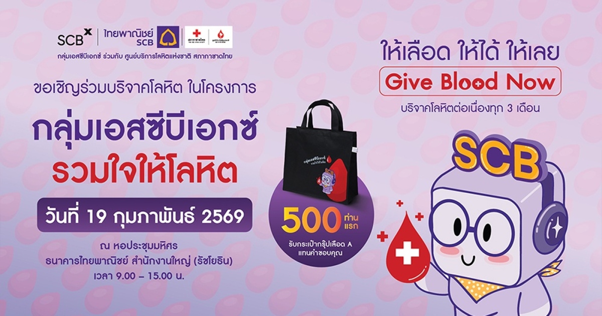 กลุ่มเอสซีบีเอกซ์ โดยธนาคารไทยพาณิชย์ ร่วมกับ ศูนย์บริการโลหิตแห่งชาติ สภากาชาดไทย ขอเชิญร่วมบริจาคโลหิต เติมเต็มปริมาณโลหิตสำรองคงคลัง ภายใต้โครงการ “กลุ่มเอสซีบีเอกซ์ รวมใจให้โลหิต” ในวันพฤหัสบดีที่ 19 กุมภาพันธ์ 2569 เวลา 9.00-15.00 น. ณ หอประชุมมหิศร ธนาคารไทยพาณิชย์ สำนักงานใหญ่ (รัชโยธิน) เพื่อส่งต่อโลหิตที่มีคุณภาพให้มีเพียงพอต่อการรักษาพยาบาลผู้ป่วยทั่วประเทศ ยังมีผู้ป่วยจำนวนมากที่กำลังรอรับโลหิตเพื่อต่อลมหายใจ “Give Blood Now ให้เลือด ให้ได้ ให้เลย” การบริจาคโลหิต 1 ครั้ง สามารถนำไปช่วยชีวิตผู้ป่วยได้มากกว่า 3 ชีวิต ผู้บริจาคโลหิต 500 ท่านแรก รับ “กระเป๋ากรุ๊ปเลือด A” แทนคำขอบคุณ