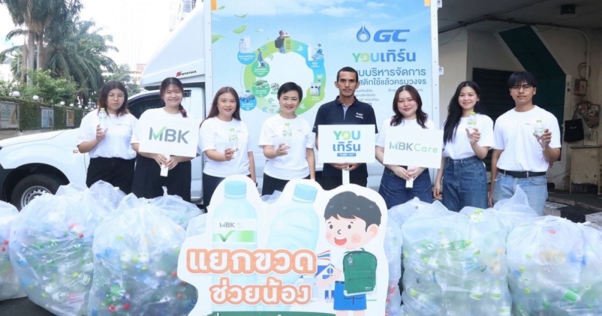 นางสาวศตกมล วรกุล ผู้อำนวยการอาวุโสฝ่ายสื่อสารองค์กร บริษัท อินเทลลิเจ้นท์ ครีเอทีฟ แอนด์ มาร์เก็ตติ้ง จำกัด (ที่ 4 จากซ้าย) ผู้บริหารธุรกิจของบริษัท เอ็ม บี เค จำกัด (มหาชน) พร้อมด้วย ตัวแทนพนักงานจิตอาสา MBK Spirit ร่วมส่งมอบขวด PETให้แก่ GC YOU เทิร์น ของบริษัท พีทีที โกลบอล เคมิคอล จำกัด (มหาชน) เพื่อเดินหน้าสานต่อในการนำขวดพลาสติกไปรีไซเคิลทำกระเป๋าในกิจกรรม “แยกขวดช่วยน้อง” ภายใต้โครงการ ข.ขวดรักษ์โลก เปลี่ยนขวดพลาสติกใสเป็นกระเป๋านักเรียนเพื่อการศึกษา ณ ศูนย์การค้าเอ็ม บี เค เซ็นเตอร์ เมื่อวันก่อน