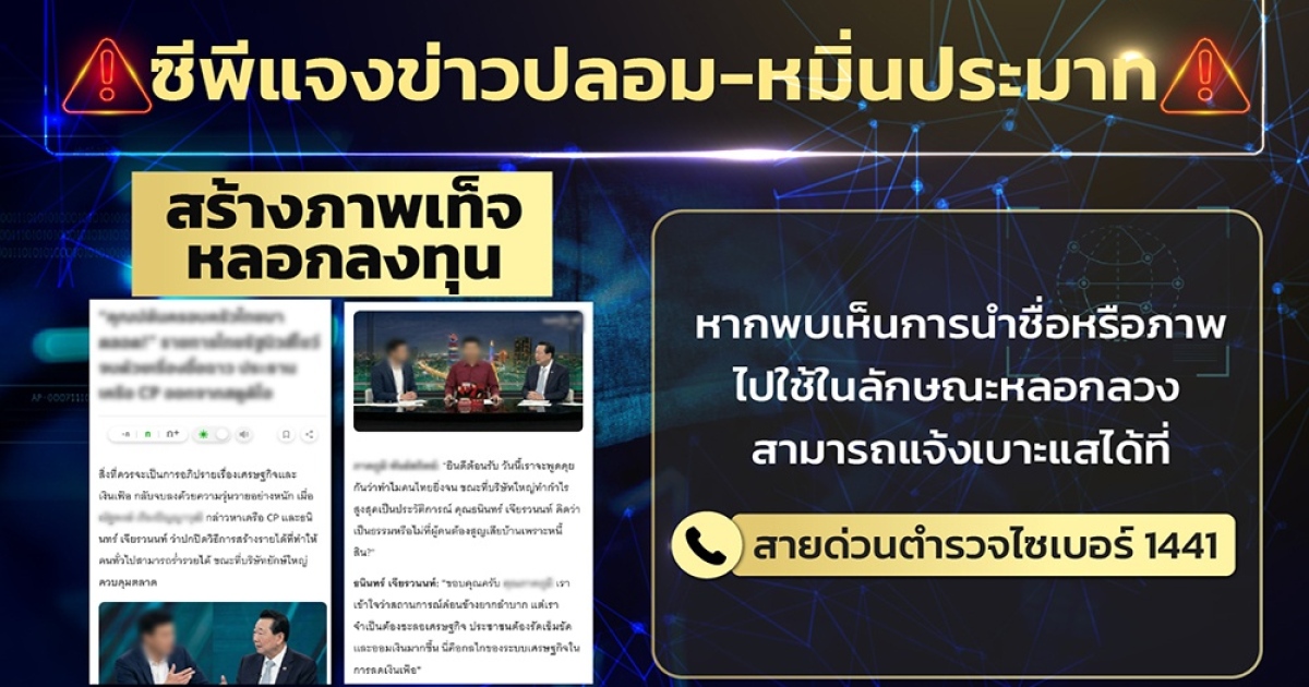 เตือนภัย! เพจปลอมสร้าง “ภาพเหตุการณ์เท็จ” แอบอ้างผู้นำซีพี–สื่อดัง ชักชวนลงทุน