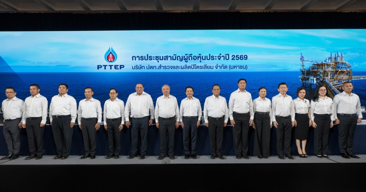 นายฉัตรชัย พรหมเลิศ (ที่ 7 จากซ้าย) ประธานกรรมการ บริษัท ปตท.สำรวจและผลิตปิโตรเลียม จำกัด (มหาชน) หรือ ปตท.สผ. พร้อมด้วยคณะกรรมการบริษัท และนายมนตรี ลาวัลย์ชัยกุล (ที่ 6 จากซ้าย) ประธานเจ้าหน้าที่บริหาร จัดการประชุมสามัญผู้ถือหุ้นประจำปี 2569 (AGM) เพื่อรายงานผลการดำเนินงานในปีที่ผ่านมา ความก้าวหน้าสำคัญในการดำเนินธุรกิจ แผนการลงทุนในอนาคต รวมถึงการรักษาความต่อเนื่องของการผลิตปิโตรเลียม เพื่อสร้างความมั่นคงทางพลังงานให้กับประเทศ ทั้งนี้ ที่ประชุมมีมติอนุมัติการจ่ายเงินปันผลสำหรับปี 2568 ในอัตราหุ้นละ 8.75 บาท