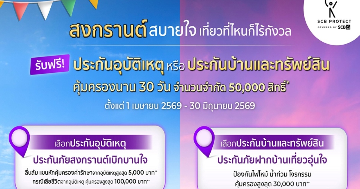 ไทยพาณิชย์ โพรเทค ส่งแคมเปญ “สงกรานต์สบายใจ เที่ยวที่ไหนก็ไร้กังวล 2569” รับฟรี! ประกันอุบัติเหตุหรือประกันบ้านและทรัพย์สิน 50,000 สิทธิ์ เพิ่มความมั่นใจก่อนออกเดินทาง