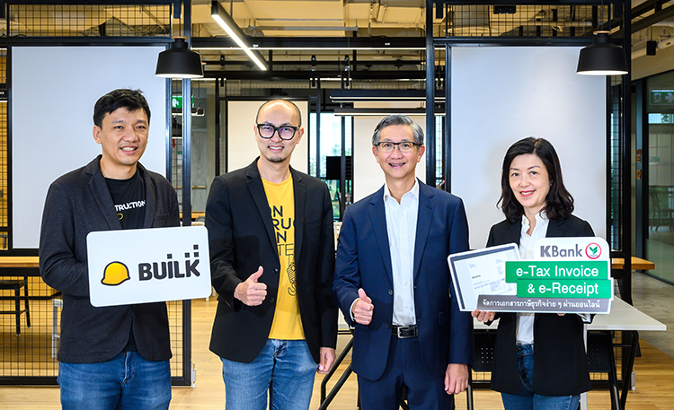 นายศีลวัต สันติวิสัฎฐ์ (ที่ 2 จากขวา) รองกรรมการผู้จัดการอาวุโส ธนาคารกสิกรไทย และนายไผท ผดุงถิ่น (ที่ 2 จากซ้าย) ประธานเจ้าหน้าที่บริหาร และผู้ร่วมก่อตั้ง บริษัท บิลค์ วัน กรุ๊ป จำกัด (BUILK) ผู้พัฒนาเว็บไซต์และซอฟต์แวร์