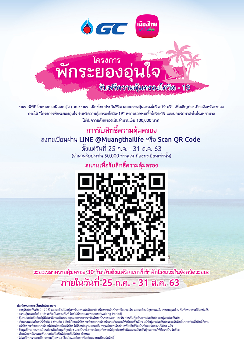 บริษัท พีทีที โกลบอล เคมิคอล จำกัด (มหาชน) หรือ GC ร่วมกับ บริษัท เมืองไทยประกันชีวิต จำกัด (มหาชน) พร้อมด้วย ดร.สาธิต ปิตุเตชะ รัฐมนตรีช่วยว่าการกระทรวงสาธารณสุข และนายพงษ์อนันต์ จันทร์ไพร ท่องเที่ยวและกีฬาจังหวัดระยอง ร่วมแถลงข่าวเปิดตัวโครงการพักระยองอุ่นใจ รับฟรีความคุ้มครองโควิด-19 เชิญชวนท่องเที่ยวจังหวัดระยอง โดย GC และเมืองไทยประกันชีวิต เตรียมพร้อมรับวันหยุดยาวปลายเดือนกรกฎาคมนี้ ร่วมสนับสนุนการมอบความคุ้มครองโควิด-19 ให้ความมั่นใจนักท่องเที่ยวที่เข้าพักในจังหวัดระยอง หลังจากการเฝ้าระวังไม่พบผู้ติดเชื้อครบ 14 วัน ตามเกณฑ์ของกรมควบคุมโรค กระทรวงสาธารณสุข สำหรับ 50,000 ท่านแรกที่ลงทะเบียนและเข้าพักที่โรงแรม ตั้งแต่วันที่ 25 กรกฎาคม 2563 ถึง 31 สิงหาคม 2563 โดยจะได้รับความคุ้มครอง 30 วันนับตั้งแต่วันที่เริ่มเข้าพักในโรงแรมวันแรก กรณีที่ผู้เอาประกันภัยตรวจพบเชื้อโควิด-19 และนอนรักษาตัวในโรงพยาบาล จะได้รับความคุ้มครองเป็นจำนวนเงิน 100,000 บาท และคุ้มครองกรณีเสียชีวิต 50,000 บาท (ทุกกรณียกเว้นการฆ่าตัวตายหรือการถูกฆาตกรรมโดยผู้รับผลประโยชน์)
