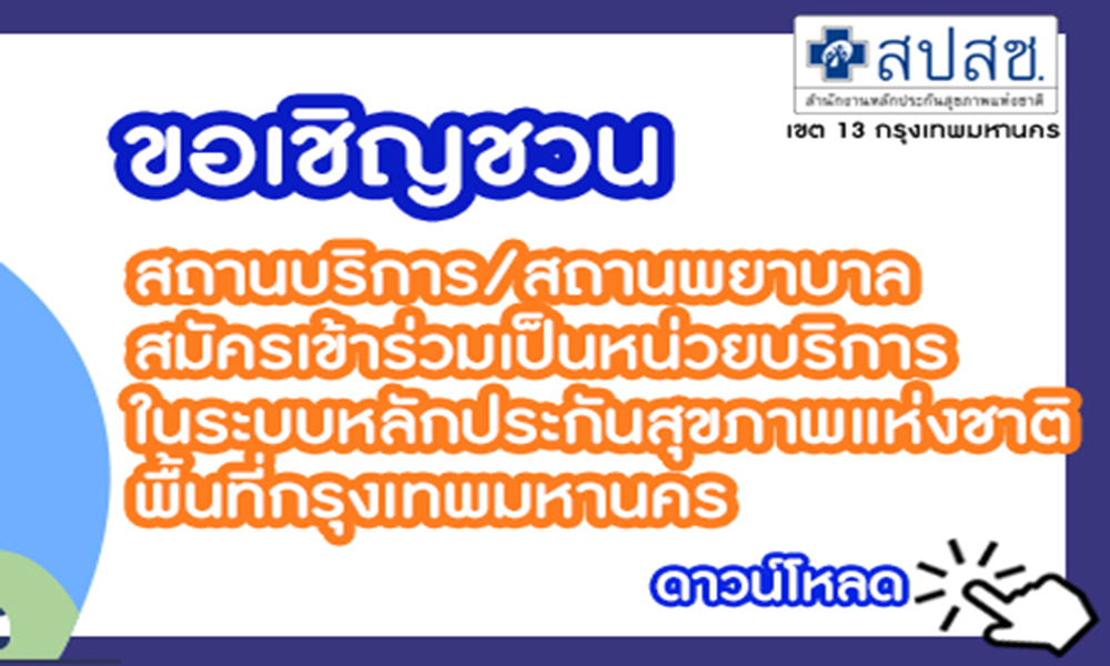 โรงพยาบาลและคลินิกเอกชนที่สนใจเข้าร่วมเป็นหน่วยบริการในระบบหลักประกันสุขภาพแห่งชาติ สมัครได้ตั้งแต่บัดนี้เป็นต้นไป เวลา 08.30-16.30 น. ยกเว้นวันหยุด เสาร์-อาทิตย์ และวันหยุดนักขัตฤกษ์ ณ สำนักงานหลักประกันสุขภาพแห่งชาติ เขต 13 กรุงเทพมหานคร ศูนย์ราชการเฉลิมพระเกียรติฯ ถ.แจ้งวัฒนะ โทร. 02-142-1000 ดูรายละเอียดการสมัครและดาวน์โหลดเอกสารได้ที่เว็บไซต์สำนักงานหลักประกันสุขภาพแห่งชาติ https://bkk.nhso.go.th/main/shownews.php?newsid=3400