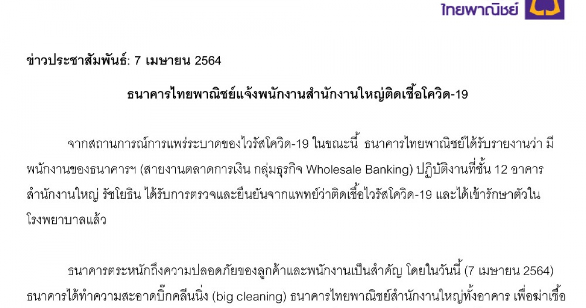 จากสถานการณ์การแพร่ระบาดของไวรัสโควิด-19 ในขณะนี้ ธนาคารไทยพาณิชย์ได้รับรายงานว่า มีพนักงานของธนาคารฯ (สายงานตลาดการเงิน กลุ่มธุรกิจ Wholesale Banking) ปฏิบัติงานที่ชั้น 12 อาคารสำนักงานใหญ่ รัชโยธิน ได้รับการตรวจและยืนยันจากแพทย์ว่าติดเชื้อไวรัสโควิด-19 และได้เข้ารักษาตัวในโรงพยาบาลแล้ว