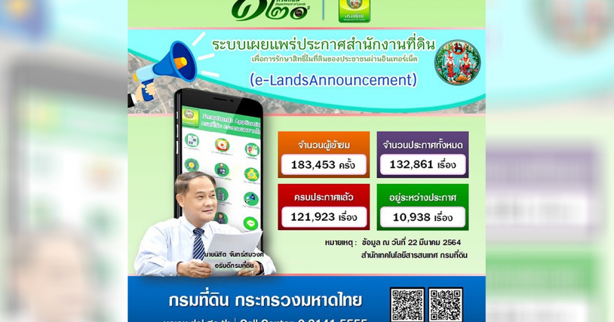 นายนิสิต จันทร์สมวงศ์ อธิบดีกรมที่ดิน เปิดเผยว่า กรมที่ดินมีความห่วงใยพี่น้องประชาชนจากสถานการณ์การแพร่ระบาดของโควิด-19 ที่เกิดขึ้นในปัจจุบัน ทำให้ประชาชนเกิดความไม่สะดวกหรือไม่มีเวลาเดินทางไปตรวจสอบประกาศการทำนิติกรรมต่าง ๆ ที่เกี่ยวข้องกับที่ดินของตนเองยังสำนักงานที่ดินนั้น ๆ เช่น มรดกเกี่ยวกับที่ดิน หรือการรังวัดข้างเคียง หากจำเป็นต้องคัดค้านก็สามารถดำเนินการได้ทันตามกำหนดเวลาเพื่อรักษาสิทธิในที่ดินของตนเอง ดังนั้น กรมที่ดินจึงได้พัฒนาระบบเผยแพร่ประกาศสำนักงานที่ดินเพื่อรักษาสิทธิในที่ดินของประชาชนผ่านอินเตอร์เน็ต (e-LandsAnnouncement) เพิ่มขึ้นอีกช่องทางหนึ่ง เพื่ออำนวยความสะดวกให้กับพี่น้องประชาชน ไม่ว่าจะอยู่ที่ทำงาน อยู่ที่บ้าน ก็สามารถตรวจสอบประกาศของสำนักงานที่ดินได้ทุกแห่งทั่วประเทศจากโทรศัพท์มือถือหรือแท็ปเล็ตได้ทันที โดยไม่ต้องเดินทางไปตรวจสอบ ณ สำนักงานที่ดินด้วยตนเอง ซึ่งปัจจุบันกรมที่ดินได้เชื่อมโยงระบบ e-LandsAnnouncement ไว้บนแอปพลิเคชัน “SMARTLANDS” เรียบร้อยแล้ว ทำให้สามารถใช้งานได้สะดวกสบายมากยิ่งขึ้นจากข้อมูลการใช้งานระบบ e-LandsAnnouncement ตั้งแต่ 1 มีนาคม 2563 ถึง 22 มีนาคม 2564 มีประชาชนเข้าใช้งานเพื่อดูประกาศแล้ว 183,453 ครั้ง ลงประกาศแล้วทั้งหมด 132,861 เรื่อง ประกาศที่ครบกำหนดแล้ว 121,923 เรื่อง และอยู่ระหว่างการประกาศ 10,938 เรื่อง กรมที่ดินหวังเป็นอย่างยิ่งว่าระบบดังกล่าวจะช่วยให้ประชาชนเกิดความสะดวกสบาย ประหยัดค่าใช้จ่าย และปลอดภัยจากโควิด-19 นี่คือ อีกหนึ่งนวัตกรรมการให้บริการประชาชนในรูปแบบดิจิทัลของกรมที่ดิน โดยทุกท่านสามารถเข้าไปใช้งานระบบเผยแพร่ประกาศสำนักงานที่ดินเพื่อรักษาสิทธิในที่ดินของประชาชนผ่านอินเตอร์เน็ต (e-LandsAnnouncement) ได้ที่เว็บไซต์ : http://announce.dol.go.th หรือดาวน์โหลดแอปพลิเคชัน “SMARTSLANDS” จากโทรศัพท์ทั้งในระบบปฏิบัติการ iOS และ Android เพียงพิมพ์ค้นหาคำว่า “SMARTLANDS” ใน App Store หรือ Play Store กดติดตั้ง ก็สามารถเข้าไปใช้งานได้ทันที