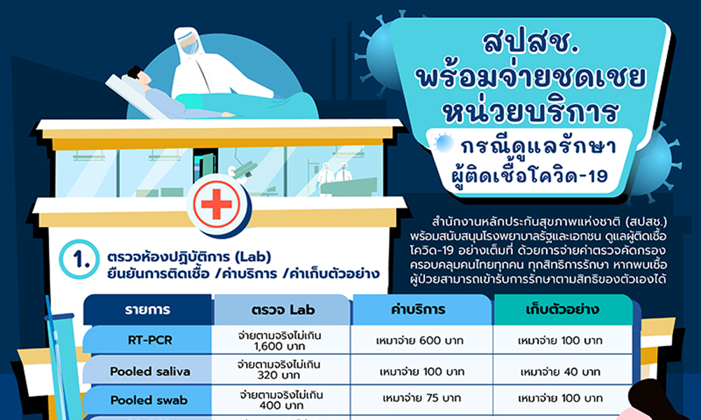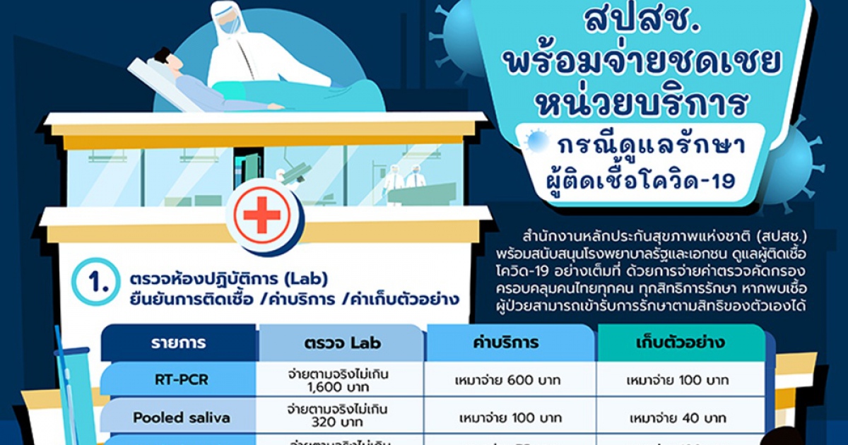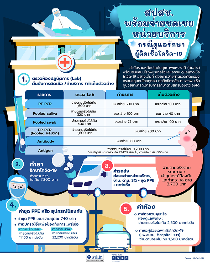 1.การตรวจด้วยวิธี RT-PCR โดยการทำป้ายหลังโพรงจมูกและลำคอ อัตราเบิกจ่ายค่าตรวจแลปจ่ายตามจริงไม่เกิน 1,600 บาท ค่าบริหารเหมาจ่าย 600 บาท ค่าเก็บตัวอย่างเหมาจ่าย 100 บาท