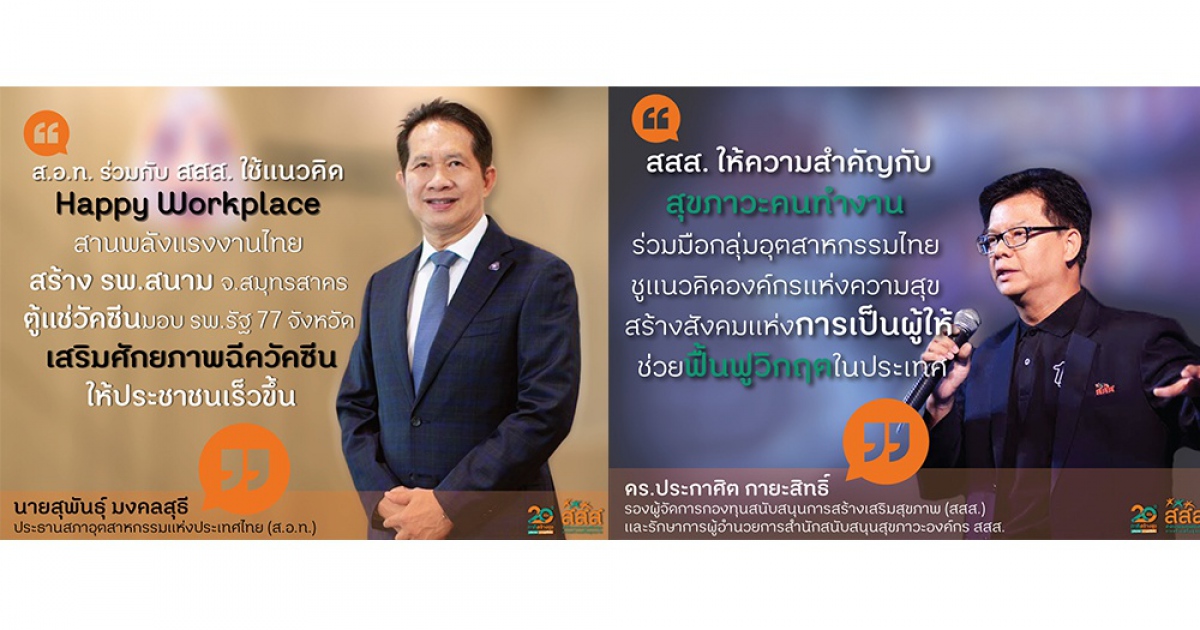 สสส.-ส.อ.ท. ชูนวัตกรรมแนวคิด Happy Workplace กระตุ้นคนทำงานมีความสุขช่วงวิกฤต สานพลังสร้าง รพ.สนาม จ.สมุทรสาคร-ตู้เก็บวัคซีน 80 ตู้ มอบ รพ.รัฐทั่วประเทศ มุ่งขยายองค์กร สุขภาวะเพิ่มอีกเท่าตัว ในกลุ่มอุตสาหกรรม 6 กลุ่ม สภาอุตสาหกรรมจังหวัด 3 แห่ง