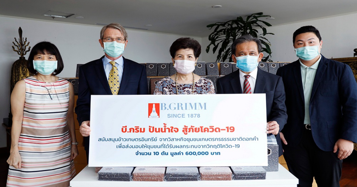ดร. ฮาราลด์ ลิงค์ ประธาน บี.กริม และประธานเจ้าที่บริหาร บริษัท บี.กริม เพาเวอร์ จำกัด (มหาชน) พร้อมด้วย คุณหญิงทิพาวดี เมฆสวรรค์ และ นายวีรพล ตั้งสุวรรณ ที่ปรึกษากิตติมศักดิ์ บริษัท บี.กริม เพาเวอร์ จำกัด (มหาชน) มอบข้าวเกษตรอินทรีย์ไรซ์เบอรี่และข้าวหอมมะลิแดง จำนวน 10 ตัน มูลค่า 600,000 บาท ซึ่งเป็นผลผลิตของกลุ่มวิสาหกิจชุมชนเกษตรอินทรีย์ดอกคำ อำเภอพร้าว จังหวัดเชียงใหม่ เพื่อนำไปช่วยเหลือชุมชนในพื้นที่ต่างๆ ที่ได้รับผลกระทบจากการแพร่ระบาดของไวรัสโควิค-19 ระลอกใหม่ ผ่านโครงการ “บี.กริม ปันน้ำใจ สู้ภัยโควิด-19”