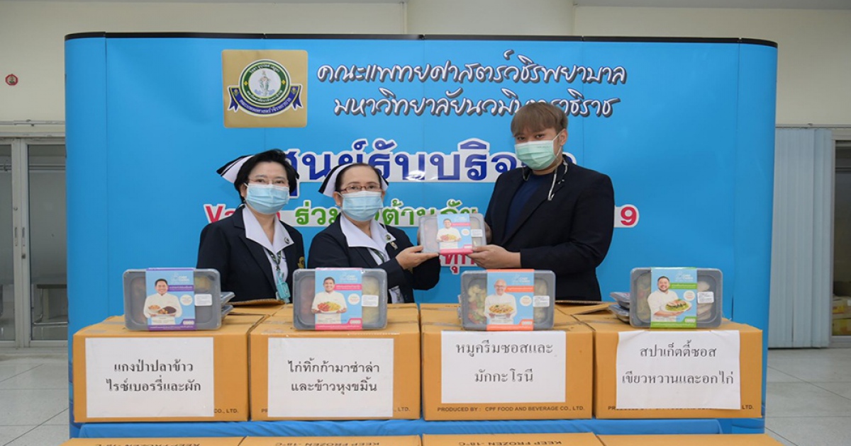 นางสาวดวงเนตร์ ภู่วัฒนวนิชย์ ผู้ช่วยคณบดี คณะแพทยศาสตร์วชิรพยาบาล และ นางสาววิไลลักษณ์ เนตรประเสริฐกุล รองหัวหน้าฝ่ายการพยาบาล คณะแพทยศาสตร์วชิรพยาบาล มหาวิทยาลัยนวมินทราธิราช รับมอบผลิตภัณฑ์อาหารสุขภาพ “เชฟแคร์ส เรดดี้มีล” จำนวน 600 แพ็ค จากผู้แทนมูลนิธิเชฟแคร์ส โดยนางมาริษา เจียรวนนท์ เพื่อเป็นกำลังใจและแทนคำขอบคุณแก่ทีมแพทย์ พยาบาล และบุคลากรทางการแพทย์ ในการต้านภัยโควิด-19 ระลอกใหม่ ณ ศูนย์รับบริจาคฯ คณะแพทยศาสตร์วชิรพยาบาล มหาวิทยาลัยนวมินทราธิราช โดยอาหารทั้งหมดเป็นอาหาร 4 เมนู จาก 4 เชฟชื่อดังระดับโลก ได้แก่ หมูครีมซอสและมักกะโรนี สปาเกตตี้ซอสเขียวหวานและอกไก่ แกงป่าปลาข้าวไรซ์เบอร์รี่ และไก่ทิกก้ามาซาล่ากับข้าวหุงขมิ้น