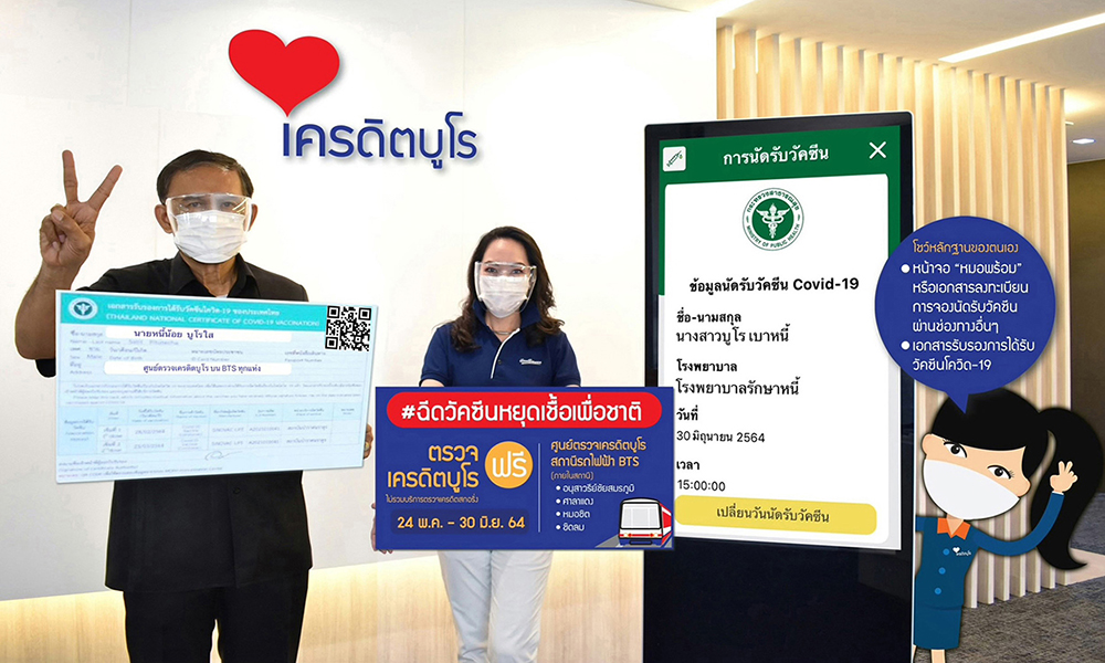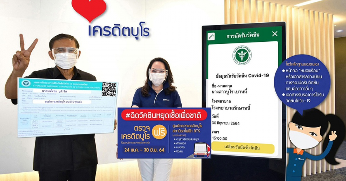 เครดิตบูโร ร่วมสนับสนุนคนไทย #ฉีดวัคซีนหยุดเชื้อเพื่อชาติ ตรวจเครดิตบูโร…ฟรี!! เพียงโชว์การจองคิววัคซีนหรือเอกสารรับรองได้รับวัคซีนโควิด-19 ได้ที่ศูนย์ตรวจเครดิตบูโรบนสถานี BTS ทุกแห่ง ตั้งแต่ 24 พฤษภาคม ถึง 30 มิถุนายน 2564