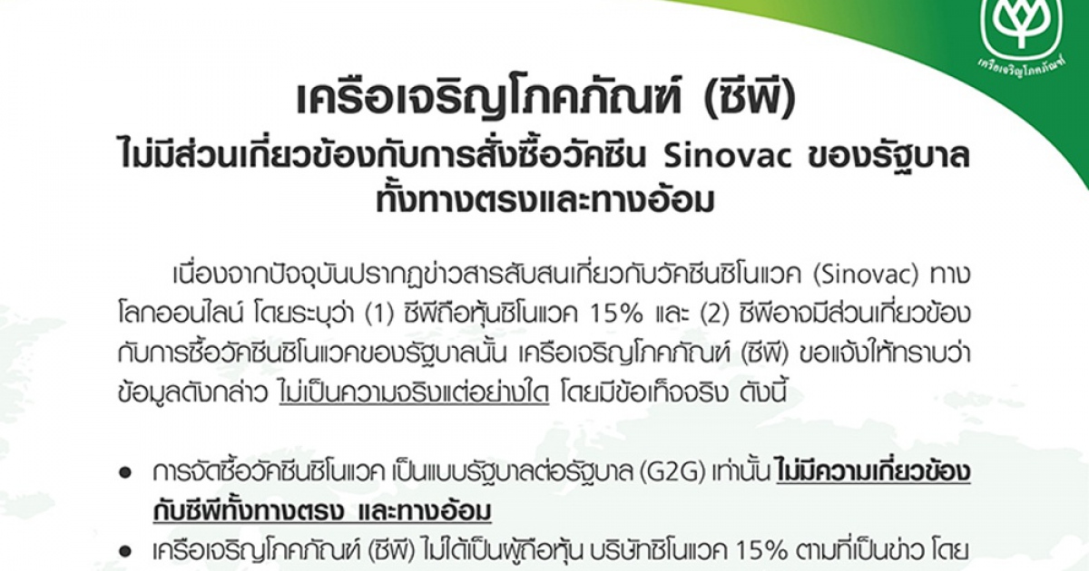 เนื่องจากปัจจุบันปรากฏข่าวสารสับสนเกี่ยวกับวัคซีนซิโนแวค (Sinovac) ทางโลกออนไลน์ โดยระบุว่า (1) ซีพีถือหุ้นซิโนแวค 15% และ (2) ซีพีอาจมีส่วนเกี่ยวข้องกับการซื้อวัคซีนซิโนแวคของรัฐบาลนั้น เครือเจริญโภคภัณฑ์ (ซีพี) ขอแจ้งให้ทราบว่า ข้อมูลดังกล่าว ไม่เป็นความจริงแต่อย่างใด โดยมีข้อเท็จจริง ดังนี้