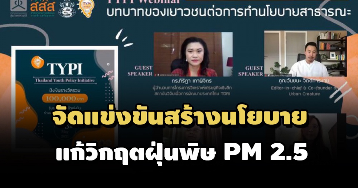 ด้าน นางสาวฐิติกาญจน์ จึงธีรพานิช Co-Chairperson Thailand Youth Policy Initiative (TYPI) กล่าวว่า TYPI เป็นองค์การด้านเด็กและเยาวชนน้องใหม่โดยตั้งขึ้นบนพื้นฐานความเชื่อว่าพลังของคนรุ่นใหม่สามารถเปลี่ยนแปลงปัญหาที่เกิดขึ้นได้ ในปีนี้เราได้ทำโครงการประกวดนโยบายและนวัตกรรมทางสังคมของคนรุ่นใหม่เพื่อแก้ไขปัญหา PM 2.5 เพื่อเฟ้นหาเยาวชน คนรุ่นใหม่ที่มีอายุระหว่าง 16-30 ปี เพื่อมาประกวดนโยบายนวัตกรรมทางสังคม แก้ไขปัญหามลพิษทางอากาศทั้งในระดับพื้นที่จนถึงระดับชาติ ข้อเสนอดังกล่าวจะนำไปร่วมกับองค์กรภาคเอกชน รัฐหรือวิชาการ ที่จะนำไปสู่การแก้ปัญหานี้จริงๆ ในทางปฏิบัติ ซี่งทำให้เห็นว่าเด็กและเยาวชนมีส่วนร่วมในการกำหนดนโยบายที่เป็นปัญหาระดับชาติได้ เนื่องจากเรื่องนี้เป็นปัญหาสิ่งแวดล้อมที่กระทบต่อสุขภาพของทุกคน และทุกๆ ปีเราต้องทนทุกข์ทรมานกับฝุ่นที่เกิดขึ้น มาจากแหล่งต่างๆ ดังนั้นเราเชื่อว่าปัญหานี้น่าจะแก้ได้ด้วยการมีนวัตกรรม เทคโนโลยีใหม่ๆ ที่มาจากความคิดของคนรุ่นใหม่
