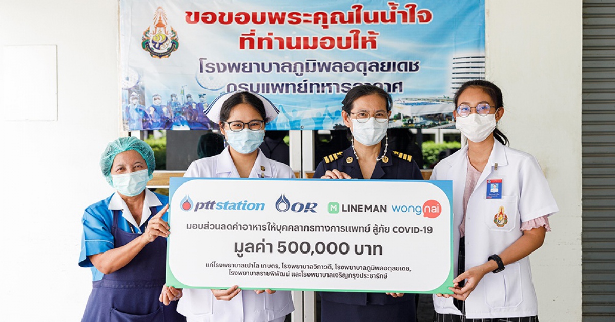 OR จับมือ LINE MAN Wongnai ส่งกำลังใจถึงบุคลากรด่านหน้าในการสกัดโรคโควิด-19 มอบโค้ดส่วนลดค่าอาหารมูลค่ารวม 5 แสนบาทให้แก่แพทย์ พยาบาล และบุคลากรทางการแพทย์ใน 5 โรงพยาบาล ได้แก่ โรงพยาบาลเปาโลเกษตร โรงพยาบาลวิภาวดี โรงพยาบาลภูมิพลอดุลยเดช โรงพยาบาลราชพิพัฒน์ และโรงพยาบาลเจริญกรุงประชารักษ์ เติมพลังในการปฏิบัติหน้าที่ดูแลผู้ป่วย ให้บุคลากรทางการแพทย์ในการสั่งอาหารจากร้านอาหารจากทั่วกรุงเทพฯ