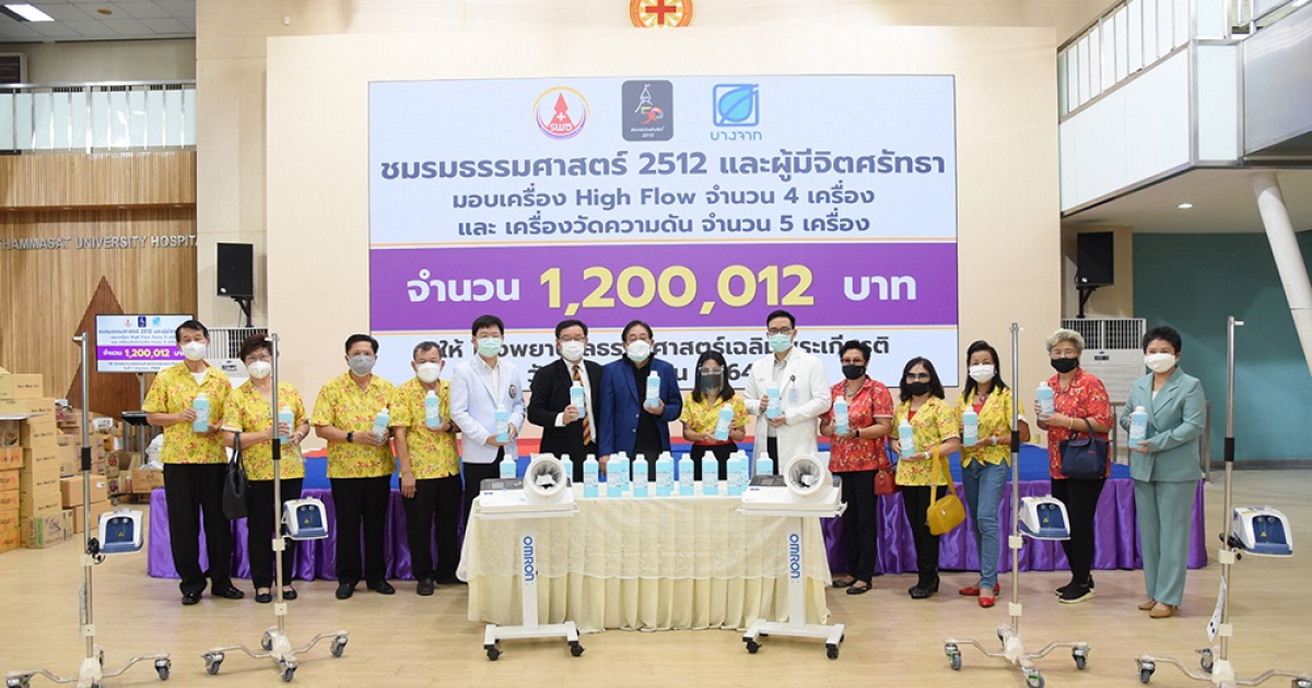 คุณพิชัย ชุณหวชิร ประธานกรรมการบริษัท บางจาก คอร์ปอเรชั่น จำกัด (มหาชน) ในฐานะประธานชมรมธรรมศาสตร์ 2512 พร้อมสมาชิกชมรมฯ และคุณกลอยตา ณ ถลาง ผู้ช่วยกรรมการผู้จัดการใหญ่ สายงานบริหารความยั่งยืนและสื่อสารองค์กร บางจากฯ ร่วมส่งมอบอุปกรณ์ทางการแพทย์ที่จำเป็นเร่งด่วนและกำลังขาดแคลน แก่โรงพยาบาลธรรมศาสตร์เฉลิมพระเกียรติ เพื่อใช้ในการรักษาผู้ป่วยโควิด-19 ประกอบด้วยเครื่อง High Flow 4 เครื่อง และเครื่องวัดความดัน 5 เครื่อง รวมมูลค่ากว่า 1.2 ล้านบาท โดยมี ศ.ดร. สุรพล นิติไกรพจน์ ประธานกรรมการ รศ.นพ. พฤหัส ต่ออุดม ผู้อำนวยการ และ ผศ.นพ. ปรีดิ์ นิมมานนิตย์ ผู้ช่วยผู้อำนวยการ ฝ่ายวางแผนและงบประมาณ โรงพยาบาลธรรมศาสตร์เฉลิมพระเกียรติ ร่วมรับมอบ