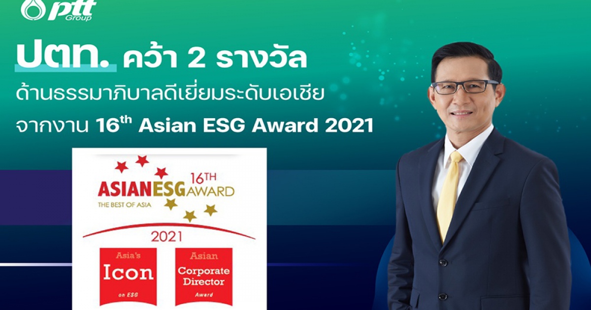 นิตยสาร Corporate Governance Asia ซึ่งเป็นนิตยสารที่ส่งเสริมสนับสนุนองค์กรที่ดำเนินธุรกิจอย่างมีธรรมาภิบาลดีเยี่ยมในภูมิภาคเอเชีย ประกาศมอบ 2 รางวัลให้ บริษัท ปตท. จำกัด (มหาชน) จากงาน 16th Asian ESG Award 2021 ประกอบด้วย “รางวัล Asian Corporate Director Award” ซึ่งมอบให้กับ นายอรรถพล ฤกษ์พิบูลย์ ประธานเจ้าหน้าที่บริหารและกรรมการผู้จัดการใหญ่ บริษัท ปตท. จำกัด (มหาชน) ในฐานะผู้นำองค์กรที่มีวิสัยทัศน์โดดเด่นด้านการบริหารจัดการองค์กรให้เติบโตอย่างยั่งยืน มีการกำกับดูแลกิจการที่ดี พร้อมขับเคลื่อนการดำเนินงานขององค์กรสู่เป้าหมาย และ “รางวัล Asian’s Icon on ESG” ซึ่งมอบให้แก่บริษัทจดทะเบียนที่เป็นแบบอย่างการดำเนินธุรกิจอย่างยั่งยืน (ESG : Environmental, Social and Governance) สะท้อนความสำเร็จของ ปตท. ในการดำเนินธุรกิจอย่างยั่งยืนในด้านสิ่งแวดล้อม สังคมและการกำกับกิจการที่ดีระดับสากล