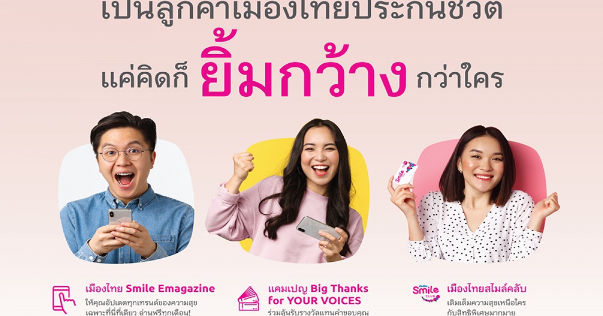ในขณะเดียวกัน บริษัทฯ พร้อมมอบความสุขให้ลูกค้าด้วยสิทธิพิเศษและบริการเพิ่มความสุขที่เหนือระดับมากมายให้ลูกค้าได้รับความคุ้มค่าที่มากกว่าแค่ความคุ้มครอง อาทิ ให้ลูกค้าได้อัปเดตทุกเทรนด์ของความสุขเป็นประจำทุกเดือนผ่านเมืองไทย Smile Emagazine อ่านฟรี ผ่านแอปพลิเคชัน MTL Click หรือเพียงแจ้งอีเมลขอรับเมืองไทย Smile Emagazine มายังบริษัทฯ หรือร่วมลุ้นรับรางวัลแทนคำขอบคุณ รวมมูลค่ากว่า 800,000 บาท* ในแคมเปญ Big Thanks for YOUR VOICES พร้อมยิ้มรับความสุขมากมายผ่านเมืองไทยสไมล์คลับ รวมถึงรับสิทธิพิเศษมากมายในเดือนเกิดที่แอปพลิเคชัน MTL Click ในเมืองไทย Happy Birthday พร้อมกันนี้ยังมีบริการด้านสุขภาพที่หลากหลายให้กับลูกค้าทุกท่าน เพื่อตอบโจทย์ทุกไลฟ์สไตล์ให้สามารถใช้บริการได้สะดวกทุกที่ ทุกเวลา ผ่าน MTL Health Services อาทิ บริการ MTL Health Buddy ผู้ช่วยด้านสุขภาพ พร้อมให้คำปรึกษาปัญหาสุขภาพ บริการ MTL Global Doctors บริการความเห็นที่ 2 ทางการแพทย์ บริการ MTL Global Connect เจ็บป่วยต่างแดน นอนโรงพยาบาลได้ทั่วโลกตามสิทธิ์ความคุ้มครอง โดยไม่ต้องสำรองจ่าย MTL Claim Cover Check บริการประเมินความคุ้มครองก่อนการรักษาจริง ทั้งนี้ลูกค้าที่สนใจซื้อประกันชีวิตและสุขภาพสามารถสอบถามข้อมูลเพิ่มเติมได้ที่ โทร. 1766 หรือติดต่อศูนย์บริการลูกค้าทั่วประเทศ หรือติดต่อตัวแทนประกันชีวิตของท่าน