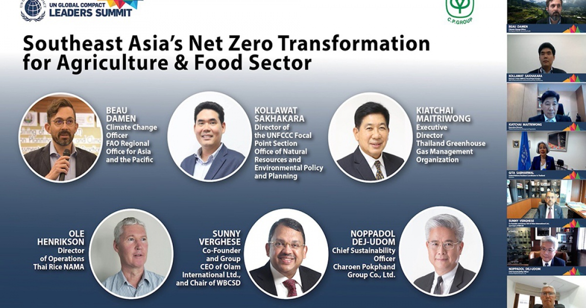 สำหรับปีนี้ถือเป็นวาระสำคัญของประเทศไทยที่ได้แสดงบทบาทและเจตจำนงในการร่วมลดโลกร้อนกับนานาประเทศ โดยมีตัวแทนผู้บริหารองค์กรธุรกิจชั้นนำของประเทศไทย นายศุภชัย เจียรวนนท์ ประธานคณะผู้บริหาร เครือเจริญโภคภัณฑ์ ได้ร่วมขึ้นเวทีหลักร่วมแบ่งปันวิสัยทัศน์ภาคเอกชนไทยต่อเป้าหมายการปล่อยก๊าซเรือนกระจกสุทธิเป็นศูนย์ นอกจากนี้เครือเจริญโภคภัณฑ์ได้รับเชิญให้ร่วมเป็นเจ้าภาพจัดเสวนาบนเวทีระดับโลกในหัวข้อ "การขับเคลื่อนอุตสาหกรรมเกษตรและอาหารในภูมิภาคเอเชียตะวันออกเฉียงใต้สู่การปล่อยคาร์บอนสุทธิเป็นศูนย์" หรือ “Southeast Asia’s Net Zero Transformation for Agriculture & Food Sector” เมื่อวันที่ 16 มิถุนายน 2564 ที่ผ่านมา โดยมี นายนพปฎล เดชอุดม ประธานคณะผู้บริหาร ด้านความยั่งยืนองค์กร เครือเจริญโภคภัณฑ์ ร่วมแสดงวิสัยทัศน์กับตัวแทนภาครัฐจากประเทศไทย ได้แก่ ดร.กลย์วัฒน์ สาขากร ผู้อำนวยการกลุ่มงานประสานงานกลางอนุสัญญา สำนักงานนโยบายและแผนทรัพยากรธรรมชาติและสิ่งแวดล้อม (สผ.) นายเกียรติชาย ไมตรีวงษ์ ผู้อำนวยการองค์การบริหารจัดการก๊าซเรือนกระจก (องค์การมหาชน) พร้อมด้วย นายโบ ดาเมน เจ้าหน้าที่ด้านการเปลี่ยนแปลงทางสภาพภูมิอากาศ จากองค์การอาหารและเกษตรแห่งสหประชาชาติ (FAO)ภาคพื้นเอเชียแปซิฟิก นายโอเล่ เฮนริกสัน ผู้อำนวยการฝ่ายปฏิบัติการ โครงการไทย ไรซ์ นามา (Thai Rice NAMA) ซึ่งดำเนินกิจกรรมด้านการทำนาเพื่อการพัฒนาที่ยั่งยืน นายซันนี่ แวร์คีส ผู้ร่วมก่อตั้งและซีอีโอบริษัท โอแลม อินเตอร์เนชั่นแนล ซึ่งทำธุรกิจด้านอาหารและเกษตร เพื่อช่วยกันผลักดัน และแสวงหาความร่วมมือกับทุกภาคส่วนในระดับนานาชาติที่จะขับเคลื่อนแผนกลยุทธ์เพื่อการลดการปล่อยก๊าซเรือนกระจกในอุตสาหกรรมเกษตรและอาหารในภูมิภาคอาเซียนให้เป็นไปตามเป้าหมายการลดโลกร้อนได้อย่างมีประสิทธิภาพ โดยมี น.ส.กีต้า ซับบระวาล ผู้ประสานงานสหประชาชาติประจำประเทศไทย เป็นผู้ดำเนินรายการ