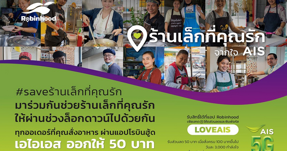 “โรบินฮู้ด” ฟู้ดเดลิเวอรี แทคทีม “AIS 5G” มุ่งช่วยร้านอาหารฝ่าวิกฤตโควิดช่วงล็อกดาวน์ ส่งแคมเปญ “ร้านเล็กที่คุณรัก” รักร้านไหน AIS ใจดีช่วยออกค่าอาหาร 50 บาท