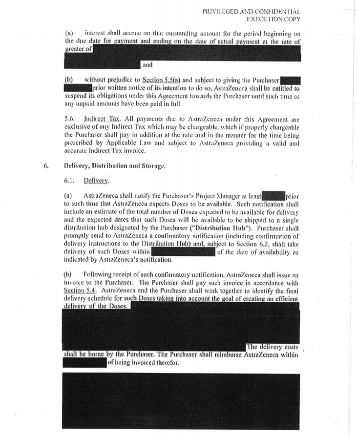 (b) ถ้า (ในเวลาใดก็ตาม) บริษัทแอสตร้าเซนเนก้าเห็นแล้วว่าจำนวนเงินเพื่อที่จะใช้ในการผลิตเพื่อที่จะใช้ในวัตถุประสงค์การจัดส่งวัคซีนของบริษัทแอสตร้าเซนเนก้านั้นมีความขาดทุน (คำว่าขาดทุนนั้นหมายถึงค่าใช้จ่ายทั้งหมด,ทั้งที่เกิดจากการผลิต และที่จากการบังคับตามกฎหมาย และการจัดส่งวัคซีนให้กับผู้ซื้อ (ข้อมูลปกปิด) และรวมถึงการชำระเงินใดๆที่ผู้ซื้อได้จ่ายไปเกี่ยวข้องกับราคาซื้อขาย) ดังนั้นแอสตร้าเซนเนก้าจะ